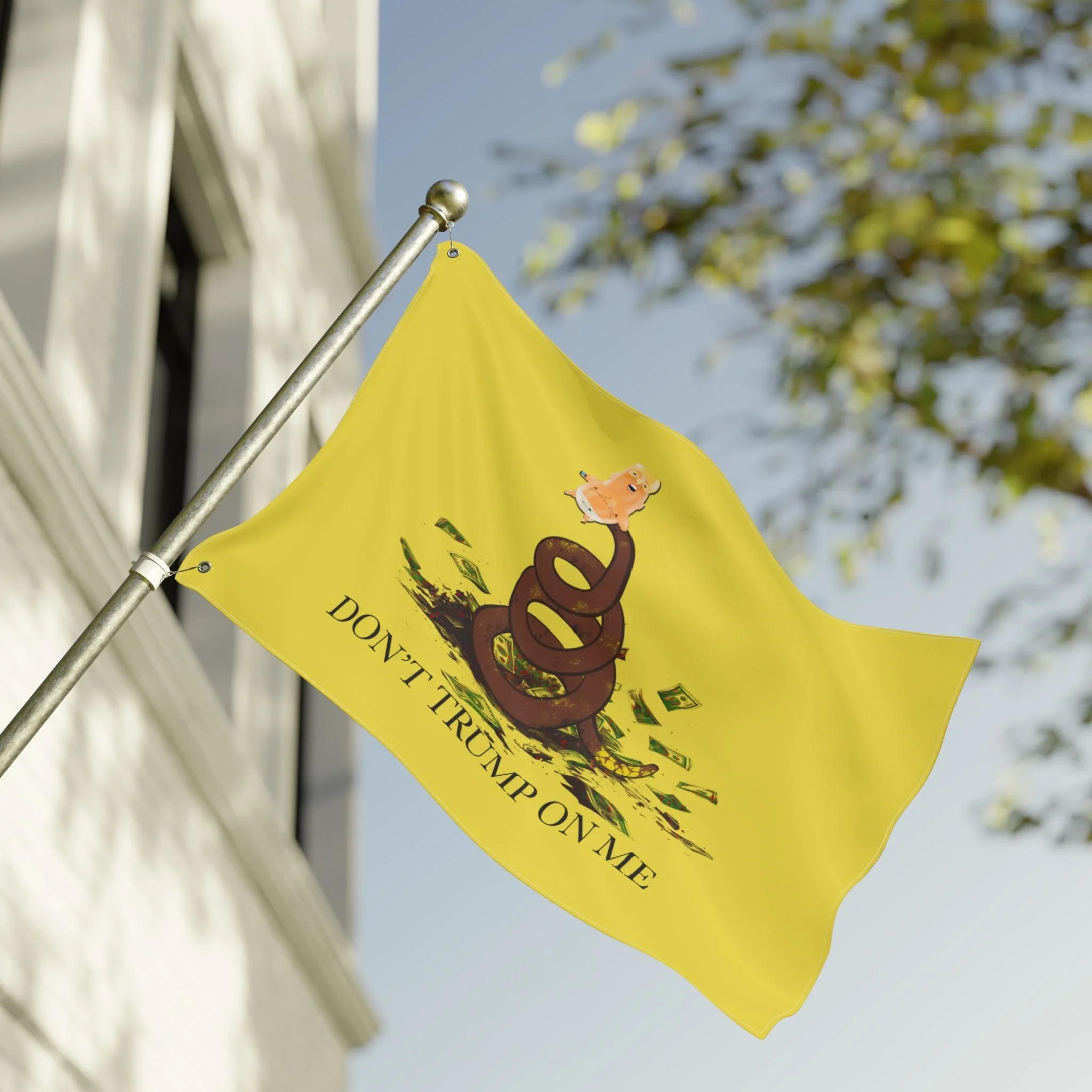 Bright, bold, and unapologetically expressive — this double-sided flag brings a bit of rebellious humor and loud color to porches, rallies, patios, or any outdoor wall that could use a statement. The sunflower-yellow field makes the central illustration pop: a coiled rattlesnake rendered in warm browns, cash scattered beneath, and a small satirical figure perched atop. The phrase below reads with a wink and an edge, giving the piece personality and voice. Lightweight and weather-ready, it moves easily in the breeze and reads from both sides thanks to the mirrored print, so your attitude shows no matter which way the wind blows. Hang it from the included metal grommets and let it add a playful, provocative energy to backyard gatherings, protest lines, or casual outdoor spaces.